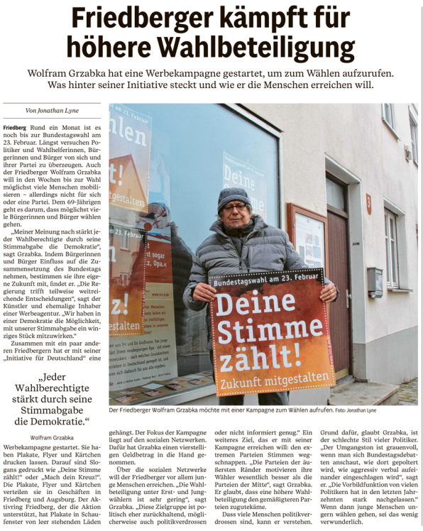 Eine hohe Wahlbeteiligung wünscht sich Wolfram Grzabka bei der Bundestagswahl am 23. Februar. Aus diesem Grund hat der Friedberger jetzt mit seiner Initiative für Deutschland, Ini>D, eine Werbekampagne gestartet. Vier Motive mit eingängigen Sprüchen hat Grzabka gestaltet und verteilt diese als Kärtchen, Plakate und über die sozialen Netzwerke. „Deine Stimme zählt!”, heißt es da, oder: „Mach Dein Kreuz!”. Grzabka: „Das Wahlrecht ist ein Eckpfeiler unserer Demokratie - durch die Stimmabgabe nehmen Wählerinnen und Wähler Einfluss auf die Politik und gestalten die eigene Zukunft mit.” Wer noch nicht sicher ist, welche Partei für sich die passende ist, könne den Wahl-O-Mat der Bundeszentrale für politische Bildung nutzen (www.wahl-o-mat.de). Dieser zeigt Übereinstimmungen der eigenen Ansichten mit den Wahlprogrammen der zur Wahl zugelassenen Parteien. Mehr dazu: www.ini-d.de