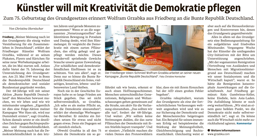 Am 23. Mai 1949 wurde die BRD als demokratischer und sozialer Bundesstaat gegründet. Aus diesem Anlass starte ich die Aktion "Bunte Republik Deutschland". > Mehr dazu