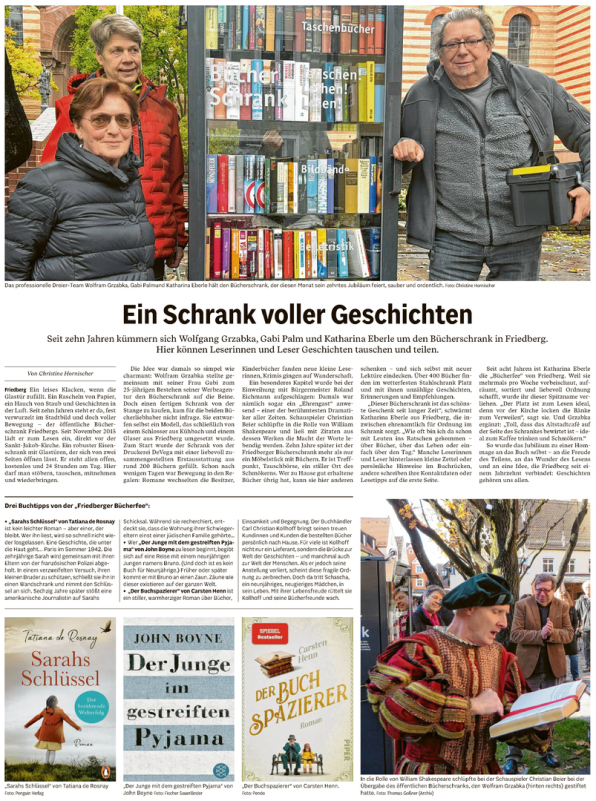 Ein BücherSchrank für Friedberg! Am 6. November 2015 wurde der von grzabka creative zum 25-jährigen Firmenjubiläum gespendete Öffentliche BücherSchrank in Friedberg von 1. Bürgermeister Roland Eichmann eröffnet. Das literarische Stadtmöbel hat einen schönen Platz mitten im Zentrum in der Ludwigstraße gefunden und steht ab sofort allen Bürgerinnen und Bürgern rund um die Uhr zur freien Nutzung zur Verfügung: Zum Tauschen, Leihen und Lesen! Vielen Dank an die ausführenden Handwerksbetriebe, Glaserei Einsiedler und Schlosserei Brettmeister, für ihre tatkräftige Unterstützung, und an die deVega Medien GmbH, für die Erstausstattung des Schrankes mit Büchern.