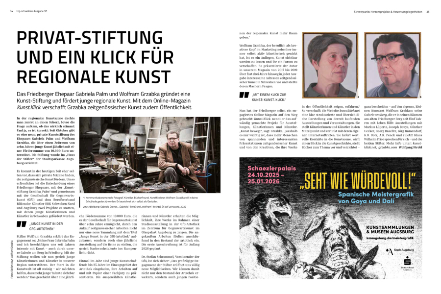 "Stille Macher" lautet der Titel der Rubrik, unter der in der aktuellen Ausgabe (4/2015) der Zeitschrift "top schwaben" auch ein ausführliches Portrait von Agenturinhaber Wolfram Grzabka erschienen ist.Vielen Dank an den engagierten Herausgeber, Wolfgang Strobl, an Roswitha Mitulla für den gelungenen Text und an Stefan Mayr für das ausdrucksstarke Foto.